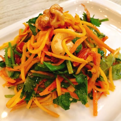 青パパイヤ、私大好きなんだけど、こちらでは売ってないので「ソムタム作れないなー」なんて思ってたんだけど、「コリンキーの食感が少し近い!」ということに気づき、そこからコリンキーソムタムと名付けてお店で出しています。