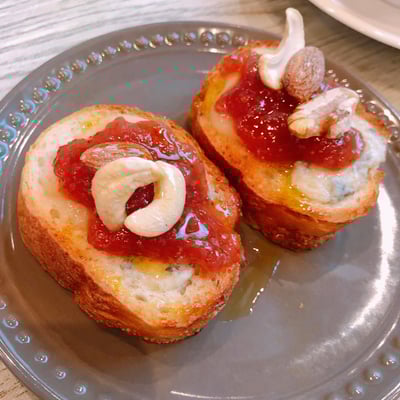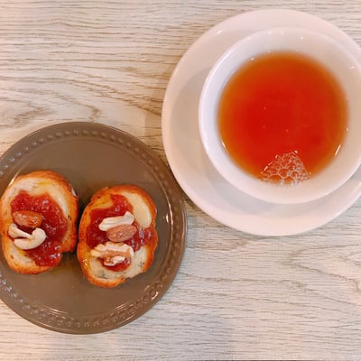 ヨーグルトやパンに乗せてシンプルに食べるのも好きだけど、私はバゲットの上にチーズ(今回はフルムダンベールとコンテの2種)を乗せて焼いて、チーズがとろっとしたらその上にジャム、そしてナッツ、オリーブオイルをかけて食べるのが大好きなのです。これはもう本当に幸せな気分になるのです。今回はワインではなく、シナモンを入れたアールグレイで。