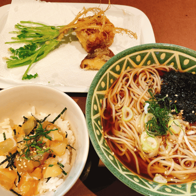 今日の賄いは、ミニ漬け丼とお蕎麦、天ぷら盛り合わせ。