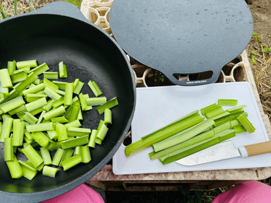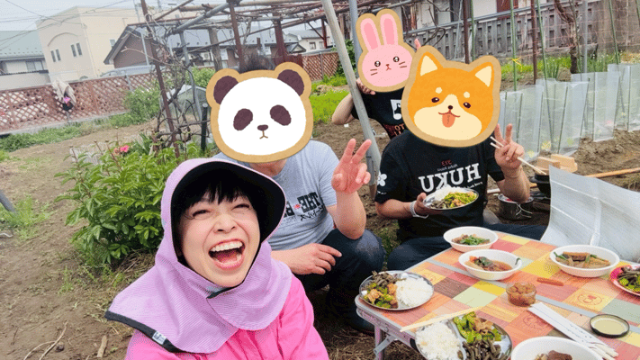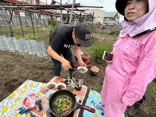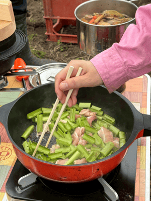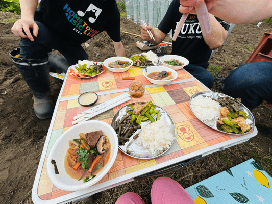 畑おじさんが炊いてくれたごはんと作ってきてくれたカルビスープ。私は畑で採れたうるいと持ってきた豚肉を炒めました。