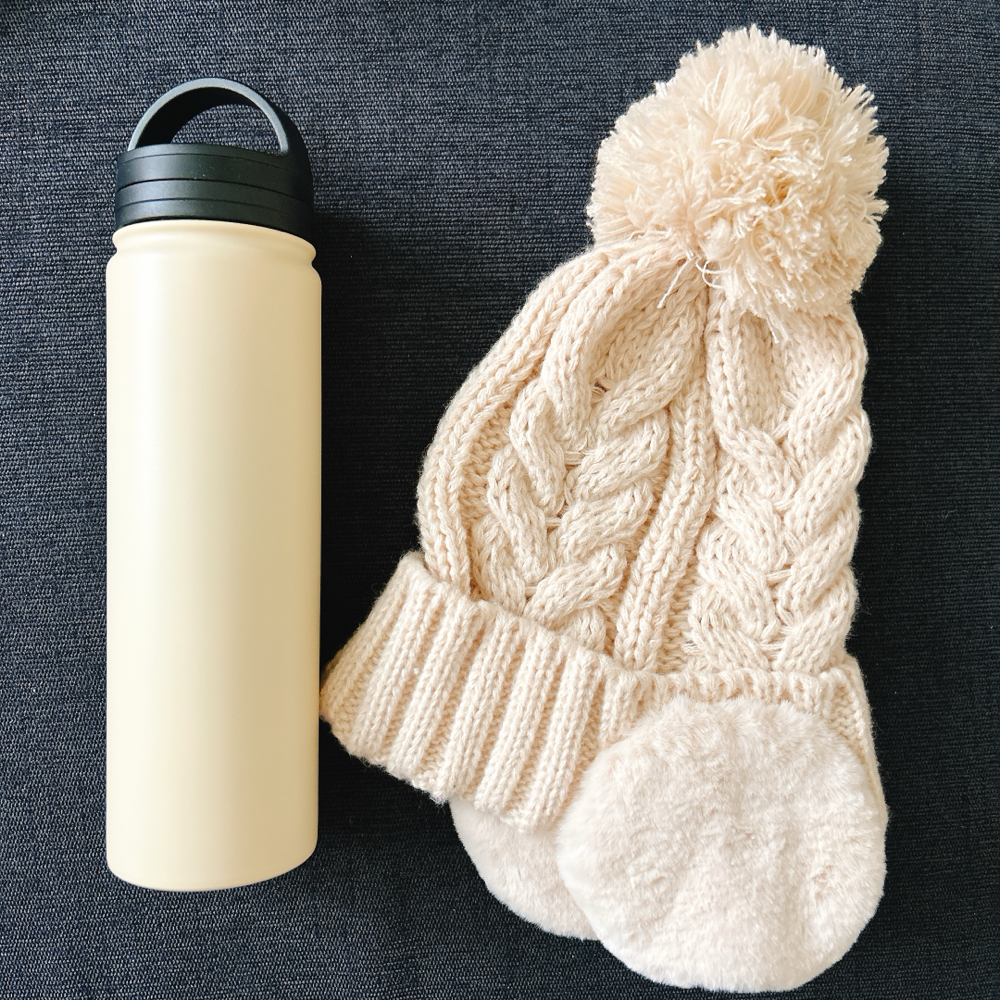 明日のサッカー応援に向けて新調。 耳当て付き帽子と水筒。 これでバッチリさ! 応援頑張るぞ!