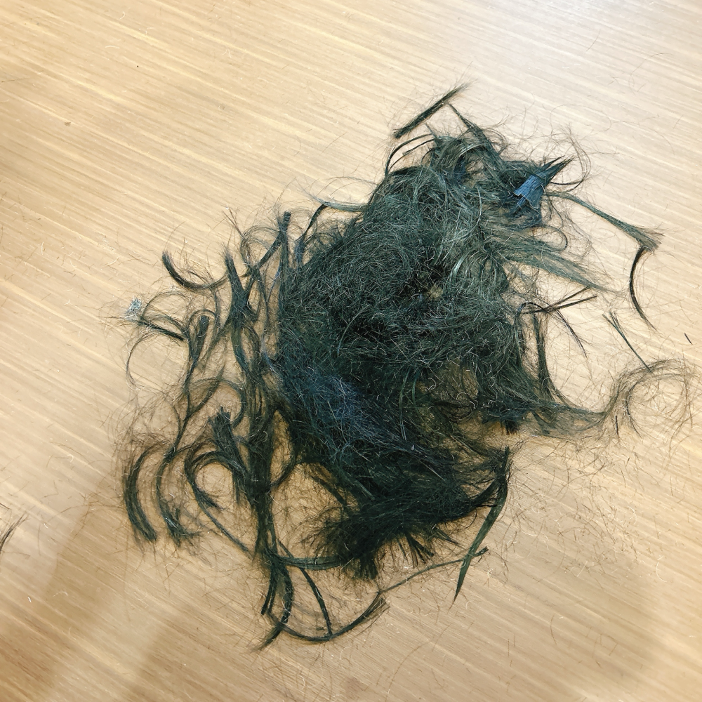 今日は髪を切りました。 冬になると髪を切りたくなるのです。 頭が軽くなってスッキリさっぱり。 短いとパパパッと洗って乾かせて楽だわー。 お風呂が楽しみになりました。 写真は切った方の髪の毛です。 さようなら。