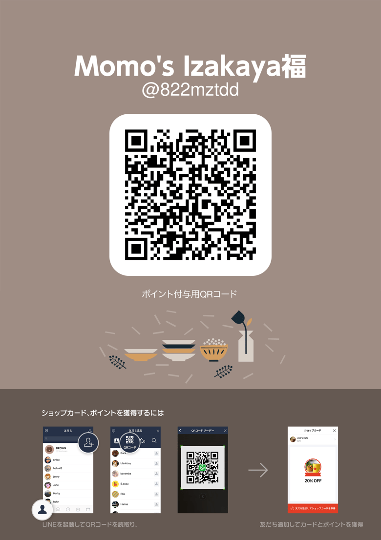 明日から2月かぁ。早いのぅ。 福では明日からスタンプカードを始めることにしました。と言っても、LINEのお友達登録が必要になりますが。良かったらLINEでお友達になってくださいね。 こちら↓QRコードを読み取っていただき、お友達登録をしていただくと来店ポイントが1つ付きます。6つ貯まると1ドリンクサービス券がもらえます。