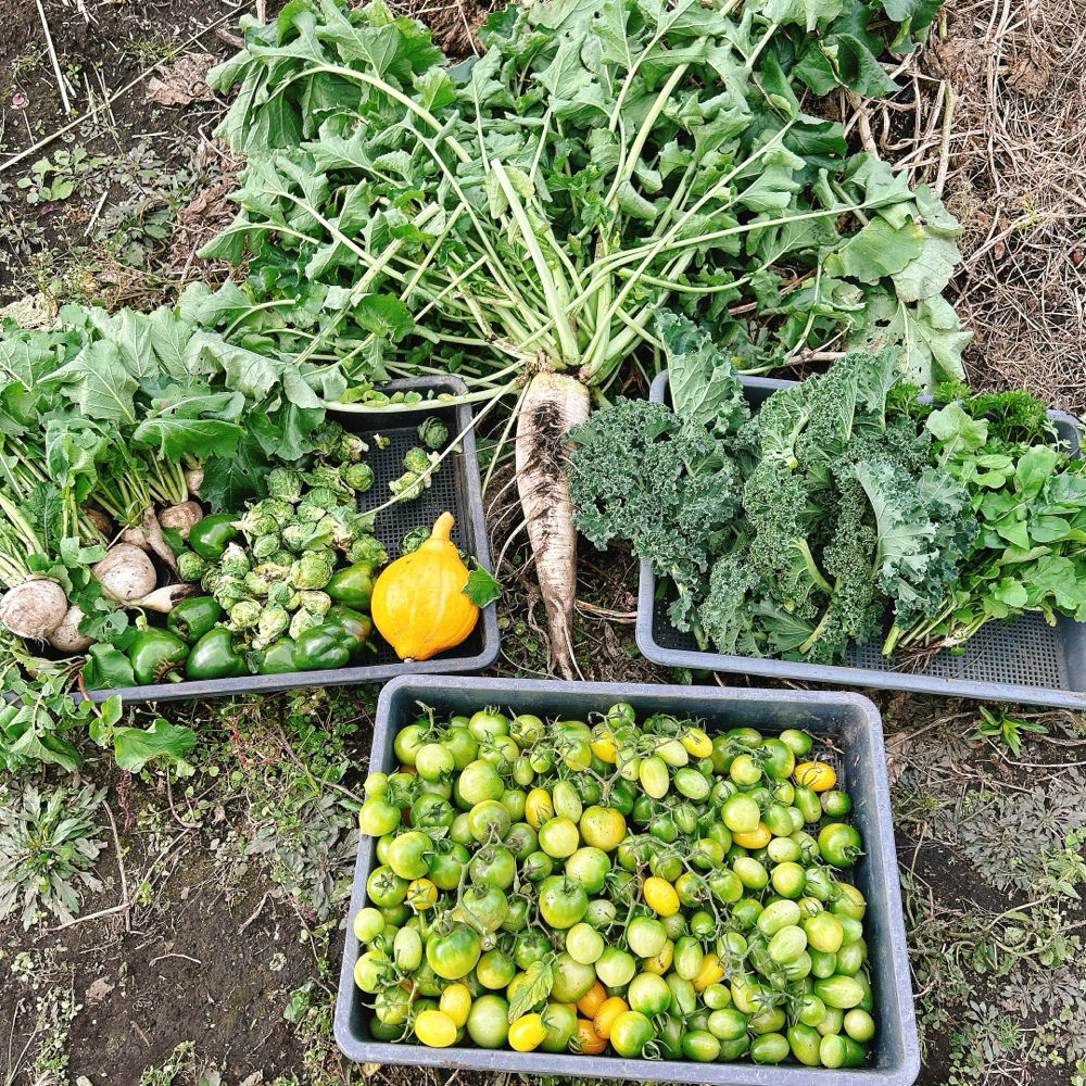 本日は芽キャベツ初収穫! イエイ! 畑も今月いっぱいまでかな? 今日は青いけどトマトを全部収穫して、白菜にひもをかけるなどしました。 青いトマトは袋にりんごと一緒に入れると追熟できるそうな。 本当かな?実験実験! 楽しみだー。