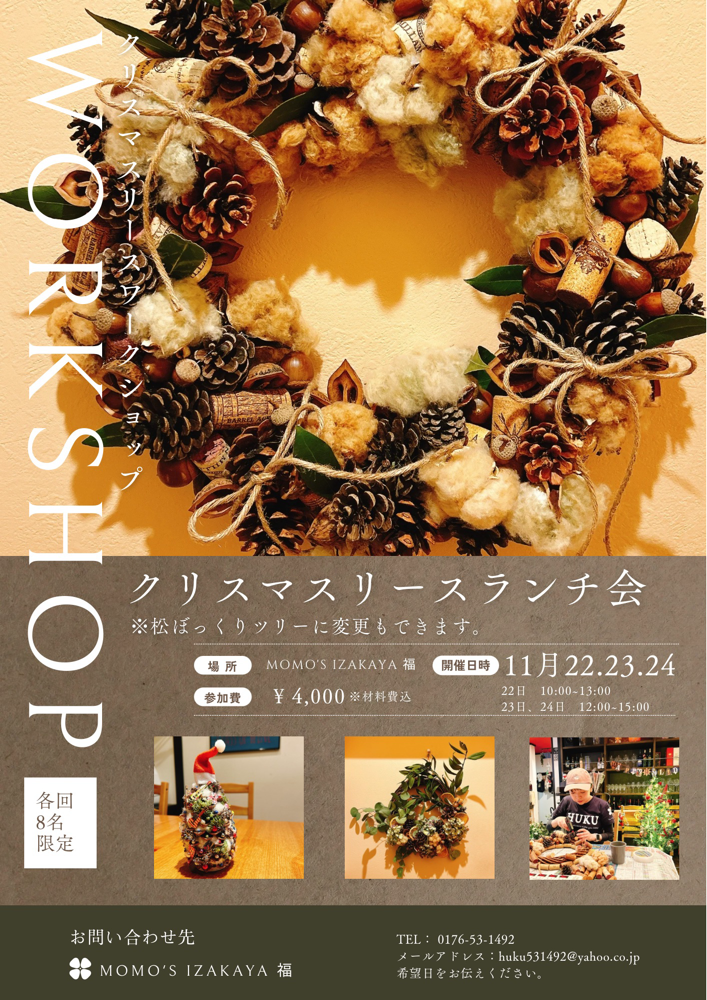 今年もクリスマスリースワークショップやります。 ランチ付きです。 今年はリースか松ぼっくりツリーのどちらか選べます! 3日間ありますのでぜひー。