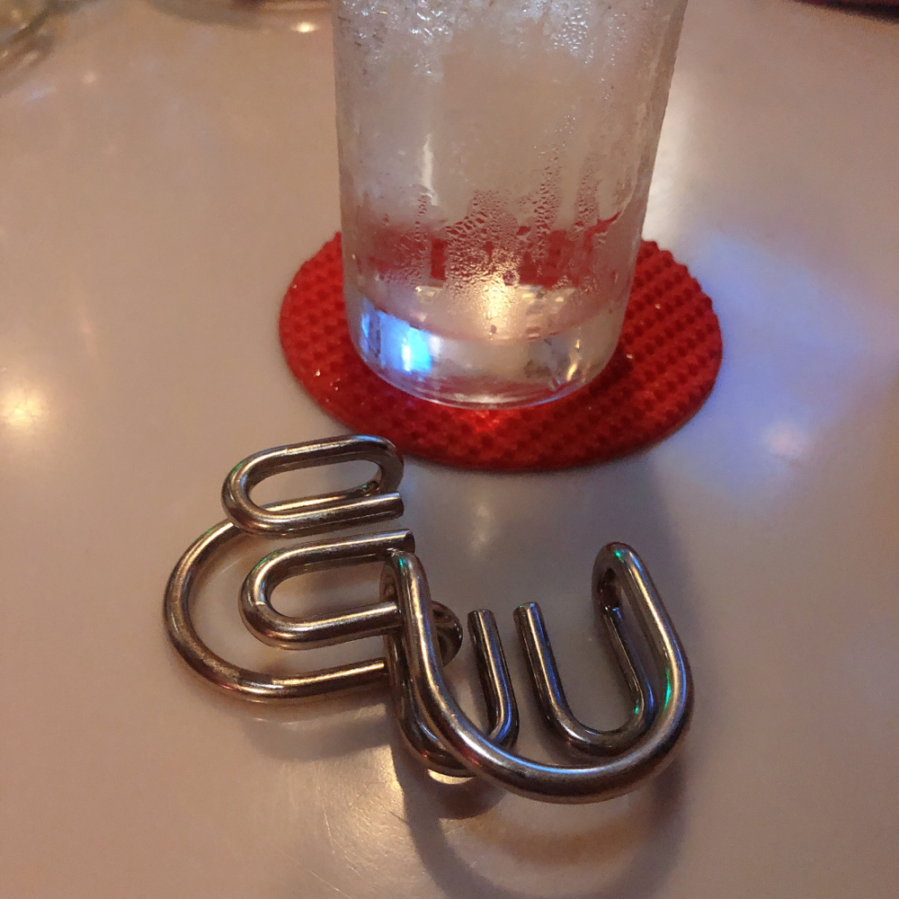 お友達のバーに行くと知恵の輪が置いてある。 飲みながらずっとやってられる。 そして、急に解ける。 なんか癖になる。 買おうかなw知恵の輪。